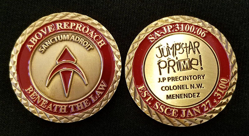 This challenge coin measures 1.5 inches and is made of die struck brass. This coin celebrates the private security firm Sanctum Adroit